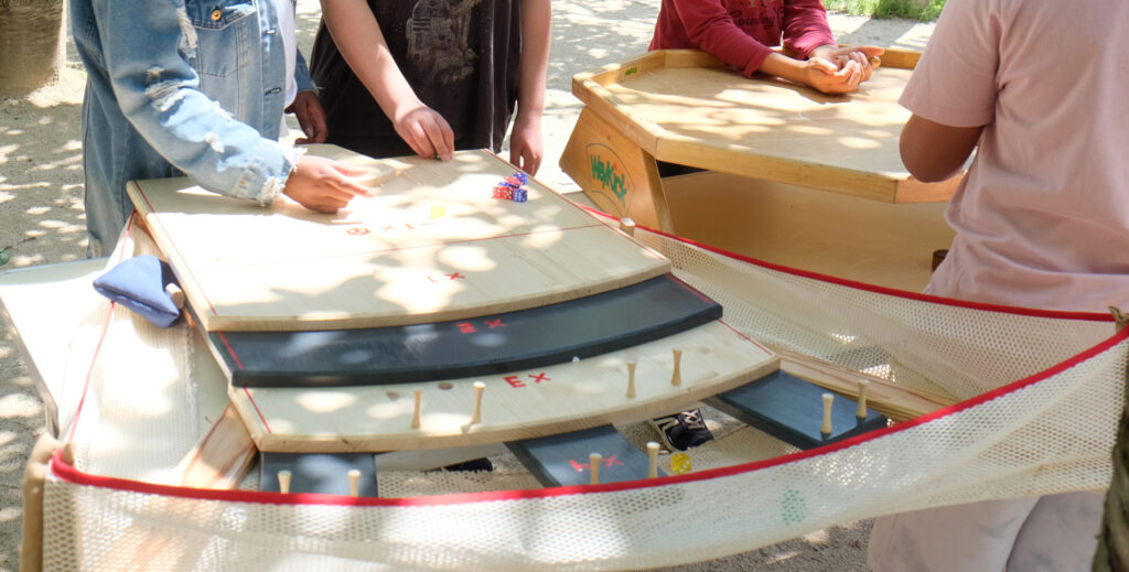 Jeu de cascade de dés, avec système de filet de récupération. Réalisé sur mesure pour les ludothèques de l’association Au Temps du Jeu.